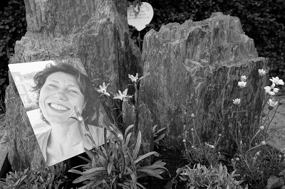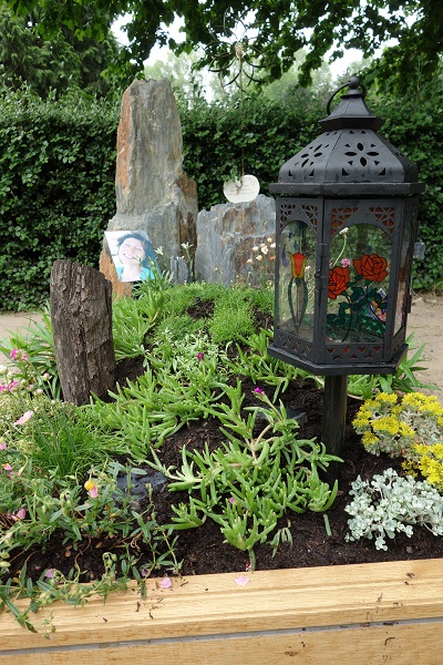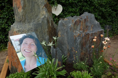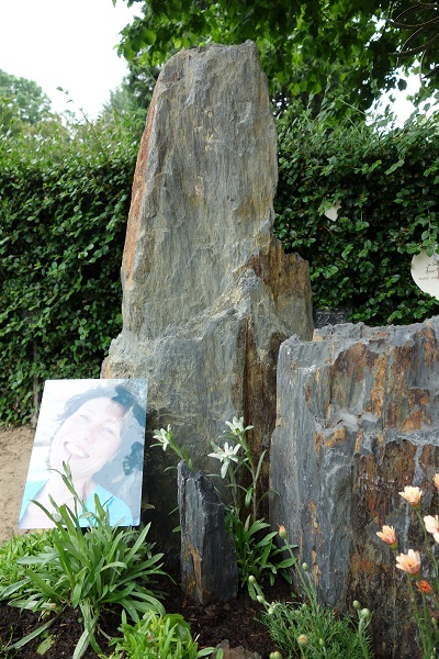 Op het windlicht heb ik een aantal symbolen geschilderd, je snapt ze vast wel als je ze goed bekijkt. Suus had een aantal symbolen altijd bij zich. In het landschap zijn een aantal stenen geplaatst, ook leisteen, en hierop staan de namen van de families, en die van mij. Zo zijn we nog een beetje dichter bij Suus.